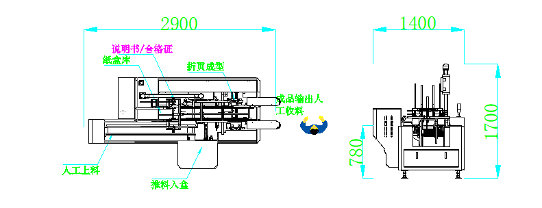 人工放置产品入装盒机物料输送--检测光电检测到物料--纸盒自动成型--成品说明书/合格证(二选一)自动下料入盒--左侧页自动折页成型--产品自动推料入盒--右侧页自动折页成型--左右大折页自动折页成型--成品输送皮带将折好纸盒输送出设备--完成